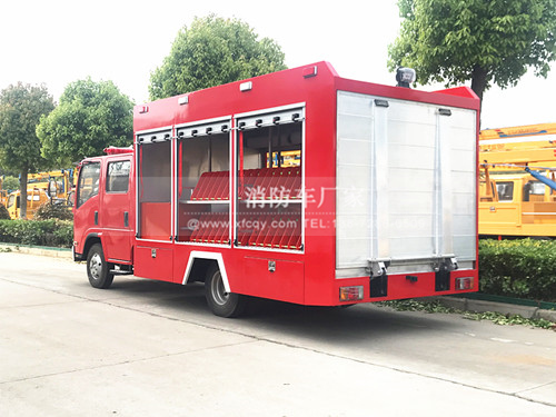 這款車型采用五十鈴700P底盤打造而成、五十鈴150馬力發(fā)動機(jī),車輛尾部配備版遙控液壓尾門操作,方便快速的操控機(jī)器人上下車,車身兩旁配備了消防水帶固定架,方便存儲更多的水帶、前部設(shè)定了各種消防器材或者手抬消防泵器材室。