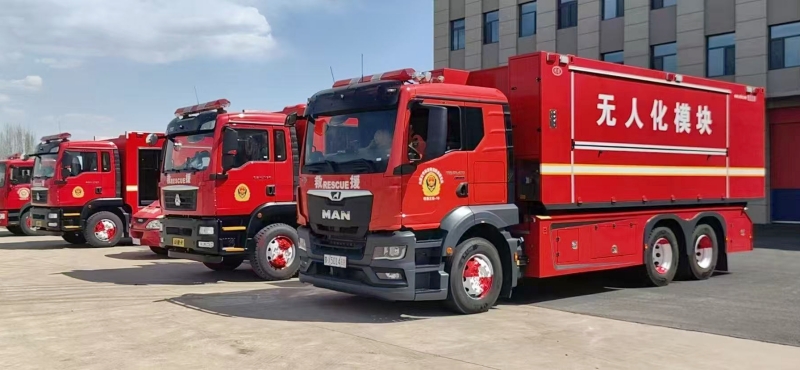無人機(jī)與地面指揮中心實時信息聯(lián)動,配套專用消防車作為貯存和供給平臺,適用于高層建筑、化工火災(zāi)等場景。