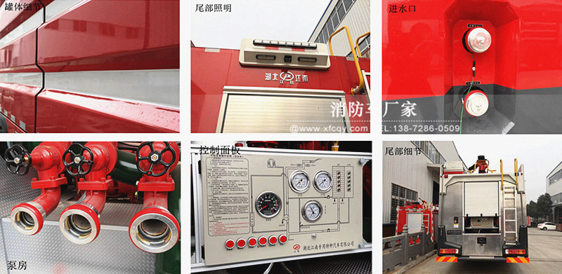 駕駛室頂部前端為長排警燈,車身后配有24V/60W火場照明燈一只,車輛兩側(cè)上方各配有紅藍(lán)相配的爆閃燈,下方安裝安全標(biāo)志燈,乘員室、器材箱、 泵房內(nèi)均裝有照明燈,加裝有100W警報(bào)器,回轉(zhuǎn)警燈開關(guān)、通訊設(shè)備預(yù)備接口。